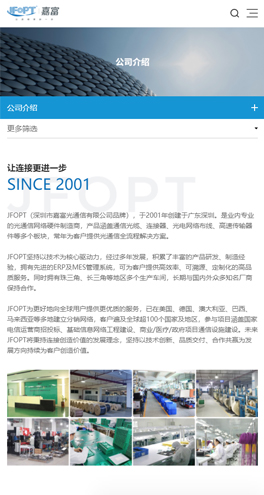 JFOPT(深圳市嘉富光通信有限公司品牌),于2001年创建于广东深圳。是业内专业的光通信网络硬件制造商,产品涵盖通信光缆、连接器、光电网络布线、高速传输器件等多个板块,常年为客户提供光通信全流程解决方案。